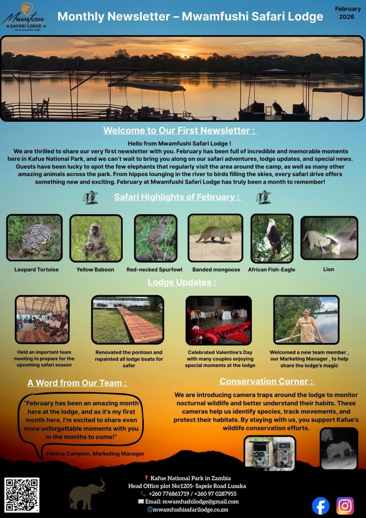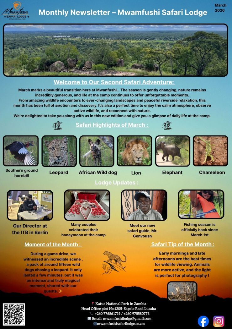 Don't miss out on this opportunity to experience the romance and wonder of Kafue National Park with your loved one. Book your 2024 honeymoon package at Mwamfushi Safari Lodge today and let us create the perfect beginning to your happily ever after.